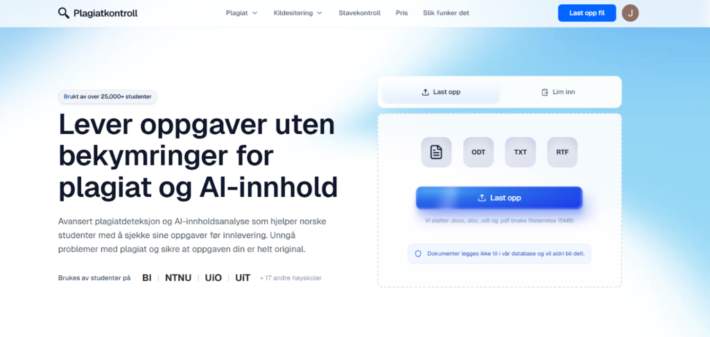 For norske brukere som vil ha plagiatkontroll og AI-deteksjon samlet, er dette det sterkeste valget i praksis: tilpasset norsk språk og behovet til dem som leverer tekst i utdanning og profesjonelle sammenhenger. Verktøyet er bygget for nettopp den typen kontroll du trenger etter språkmodellbruk – både overlapp mot andre tekster og signaler som kan tyde på maskinelt innhold.